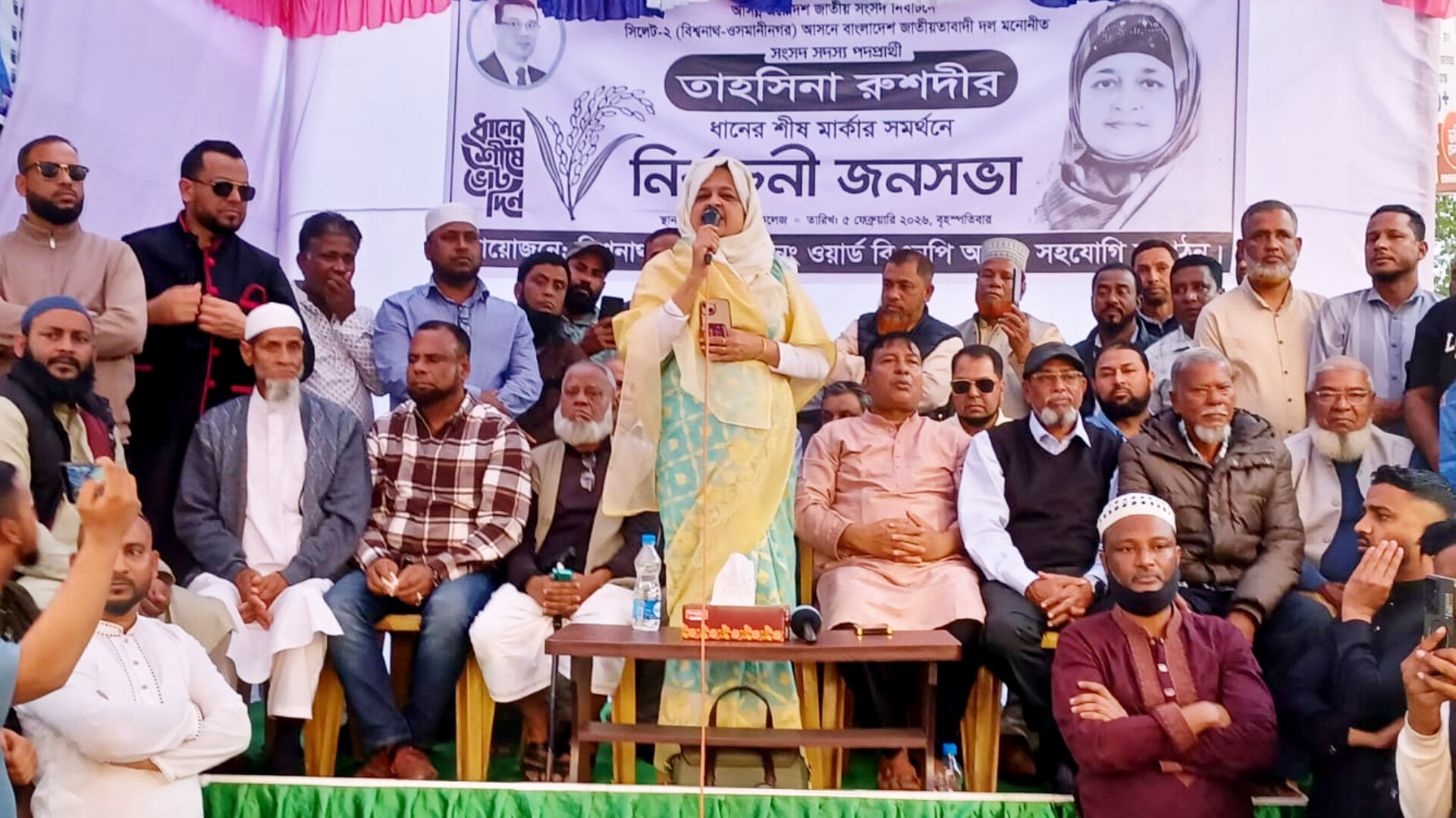এলাকার প্রবীন মুরব্বী মফিজুর রহমানের সভাপতিত্বে এবং যুবদল নেতা রুমেল মিয়া ও আমির আলীর যৌথ পরিচালনায় ধানের শীষের সমর্থনে অনুষ্ঠিত নির্বাচনী জনসভায় বিশেষ অতিথির বক্তব্য রাখেন জেলা বিএনপির সাবেক সহ সভাপতি ও বিশ্বনাথ উপজেলা পরিষদের দু’বারের সাবেক চেয়ারম্যান সুহেল আহমদ চৌধুরী, বিশ্বনাথ পৌর বিএনপির সভাপতি হাজী আব্দুল হাই, উপজেলা বিএনপির সহ সভাপতি আব্বাস আলী, সাবেক সহ সভাপতি নাজমুল ইসলাম রুহেল, সাবেক সাংগঠনিক সম্পাদক কবির হোসেন ধলা মিয়া চেয়ারম্যান, বিশ্বনাথ ইউনিয়ন পরিষদের চেয়ারম্যান দয়াল উদ্দিন তালুকদার, দেওকলস ইউনিয়ন পরিষদের সাবেক ভারপ্রাপ্ত চেয়ারম্যান খায়রুল আমিন আজাদ, উপজেলা জমিয়তে ওলামায়ে ইসলামের সহ সভাপতি মাওলানা সিরাজুল ইসলাম, যুক্তরাজ্যের ওল্ডহাম বিএনপির সভাপতি জামাল উদ্দিন, যুক্তরাজ্য বিএনপি নেতা ও উপজেলা ছাত্রদলের সাবেক সভাপতি আব্দুল হালিম, যুক্তরাজ্যের ব্রাডফোড যুবদলের সভাপতি রুহেল মিয়া, যুক্তরাষ্ট্র বিএনপি নেতা মুজিব আহমদ মনির, যুক্তরাজ্য বিএনপি নেতা ও উপজেলা ছাত্রদলের সাবেক সহ সভাপতি খলিলুর রহমান, বিএনপি নেতা মাহতাব উদ্দিন, শ্রমিক নেতা দিলোয়ার হোসেন, পৌর যুবদলের যুগ্ম আহবায়ক শাহজাহান মিয়া, জেলা ছাত্রদলের যুগ্ম সম্পাদক তাজুল ইসলাম সাজু, উপজেলা ছাত্রদলের সদস্য সচিব ফাহিম আহমদ, বিশ্বনাথ সরকারি কলেজ ছাত্রদলের সাবেক সাধারণ সম্পাদক একে রাজু, ছাত্রনেতা শেখ শাহজাহান, আব্দুর রব।