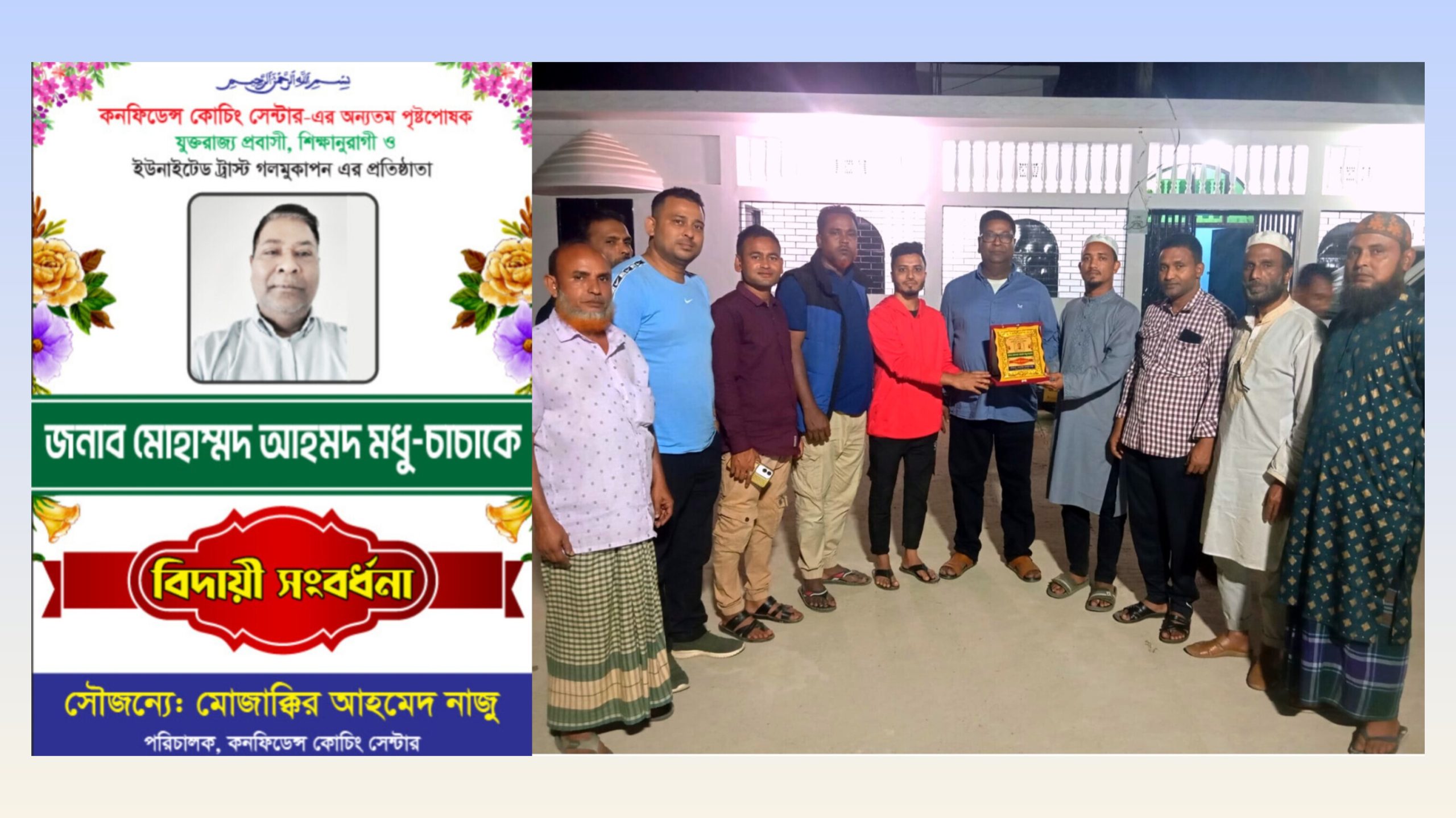 ২৬ শেষ ফেব্রুয়ারী বৃহস্পতিবার সন্ধ্যায় কনফিডেন্স কোচিং সেন্টারের উদ্যোগে যুক্তরাজ্য প্রবাসী শিক্ষানুরাগী ইউনাইটেড ট্রাস্ট গলমুকাপন এর প্রতিষ্ঠাতা কনফিডেন্স কোচিং সেন্টারের পৃষ্ঠপোষক জনাব মোহাম্মদ আহমেদ মধুকে সম্মাননা স্মারক তুলে দেয়া হয়।