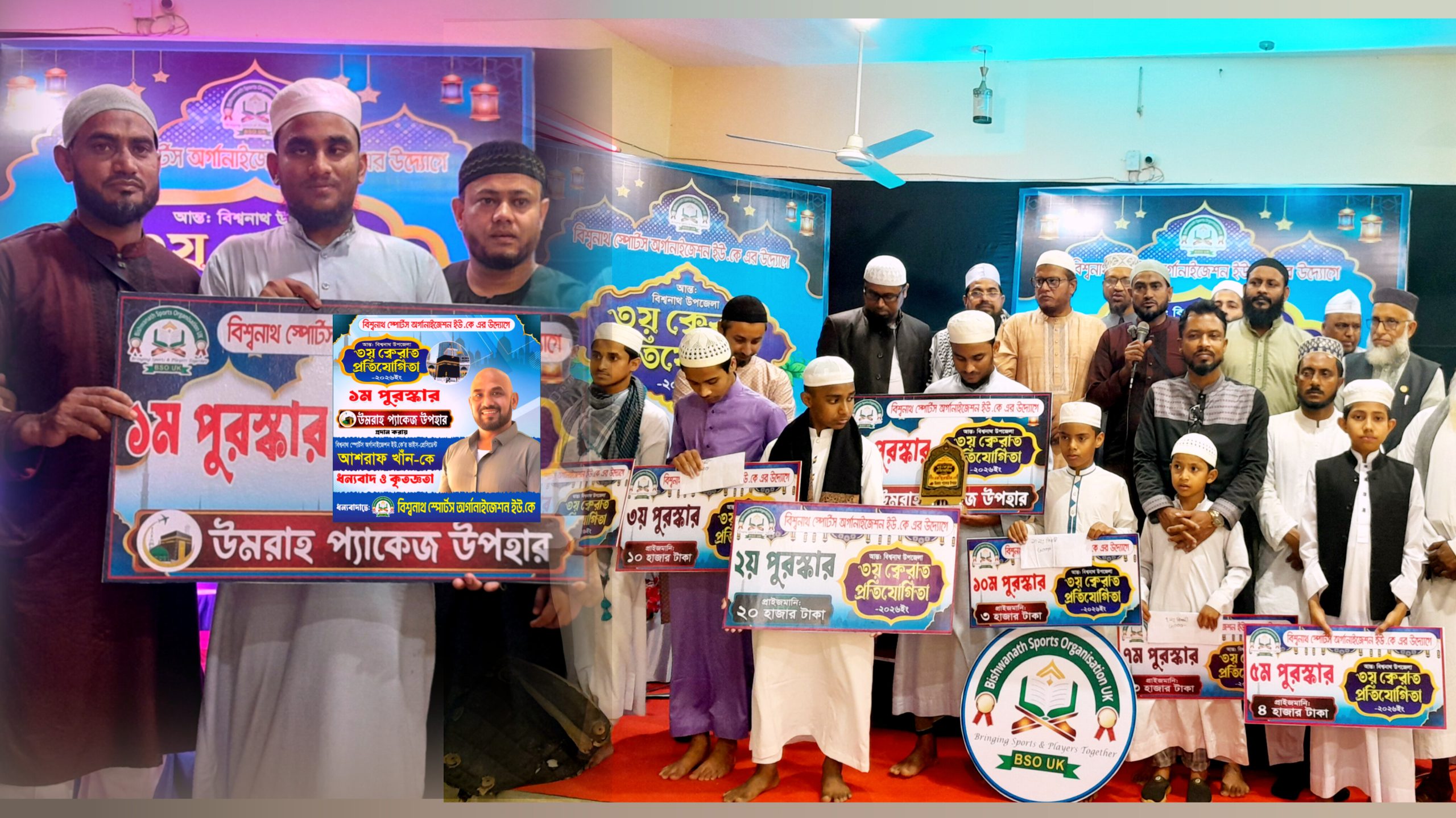 উক্ত উমরা হজ প্যাকেজ পুরস্কারটি প্রদান করেন বিশ্বনাথ স্পোর্টস অর্গানাইজেশন ইউকের ভাইস প্রেসিডেন্ট আশরাফ খান।