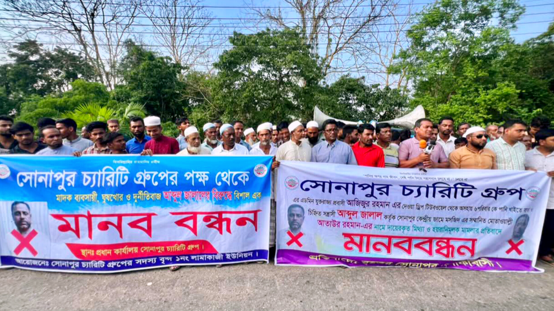 মানববন্ধনে বক্তারা বলেন, আব্দুল জালাল এলাকার একজন চিহ্নিত সন্ত্রাসী, মাদক ব্যবসায়ী, চোরাচালানকারী, ঘুষখোর ও দূর্নীতিবাজ ব্যক্তি। জালাল উদ্দিনের মাদক ও চোরাচালান’সহ নানান অপরাধমূলক কর্মকান্ডে সমস্ত গ্রামের মানুষ অতিষ্ঠ। সে গ্রামের কারও কথা সে শুনে না, মানে না।